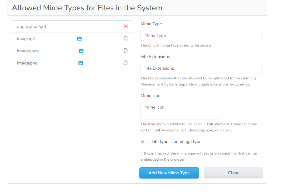 The last extra I added was the ability to define system files types that are allowed to be uploaded into the system. The idea is to create a central place where all the files allowed were defined. This is done through the MimeType