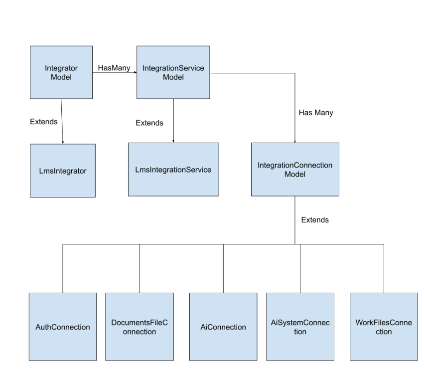 The last part in this system is the IntegrationConnection model. Each IntegrationService model will have a HasMany-BelongsTo relationship with multiple instances of Connection classes. Each connection is define in the database as a connection between the system or a user and the service. Each connection must also have it's own class, which will be filled out when a connection is established. The IntegrationConnection class is extended bty a large number of Connection classes that each describe a different type of connection. For example, we will have AuthenticationConnection class that only deals with authentiucating users (or the system) to a service, or the DocumentFilesConnection class, which ties a user to an external repository of documents. Currently, I wrote 5 connection classes: