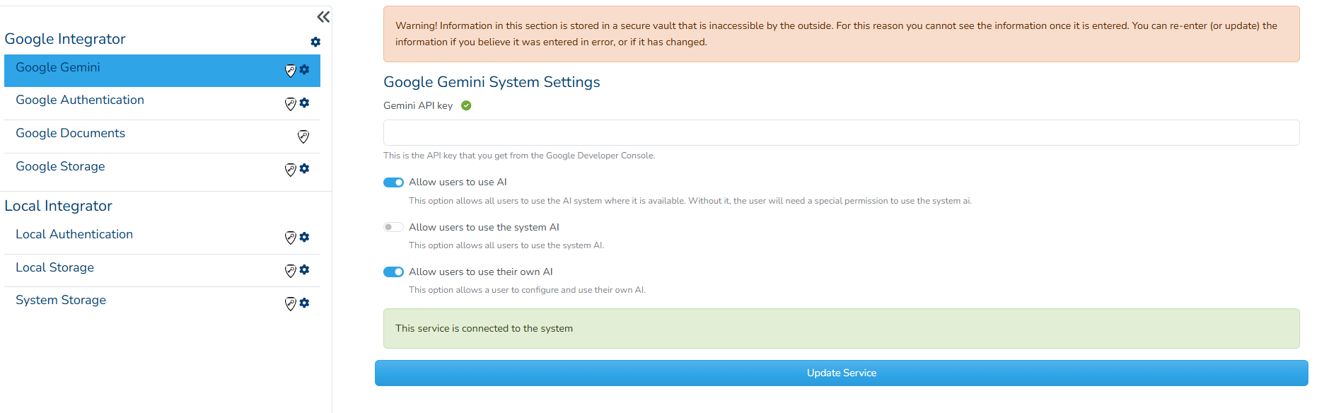 In the picture above, you will see the next integration that I added: AI. I already had some AI code built, back when I created the Rubrics code, so I felt it was an easy step to create and bring in the AI capabilities into the actual system. I decided to stick with Google, although I may do something with OpenAI as well. With this new service, I also introduced the idea of a Secure Vault. This vault will take important values and write them to a safe file in a private space, thus avoiding having to encrypt the values in the Database. However, I felt that this would blow up too much if it was applied to users, so I did end up adding support for encrypted values in the database. Thus, system AI settings are stored in an external file, which personal AI settings are stored encrypted in the Database.