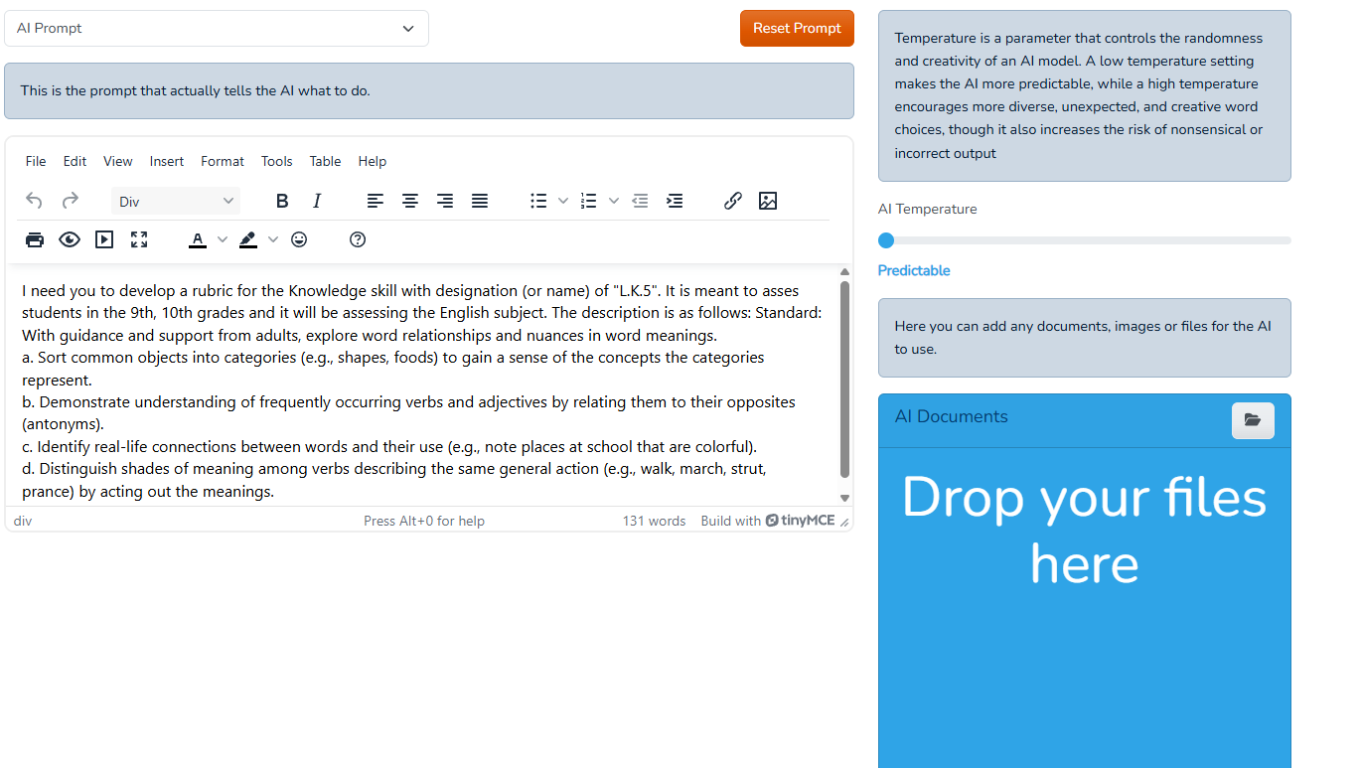 A neat little add on, is the ability to edit a prompt for each object, either as a system prompt (for system users) or as a personal prompt for teachers to run. Clicking on the edit for the prompt will take the user to the edit prompt system, which allows the user to directly change the prompt being sent to the AI to match their desires. From here, they can also set the AI temperature, and even upload documents for the AI to use.